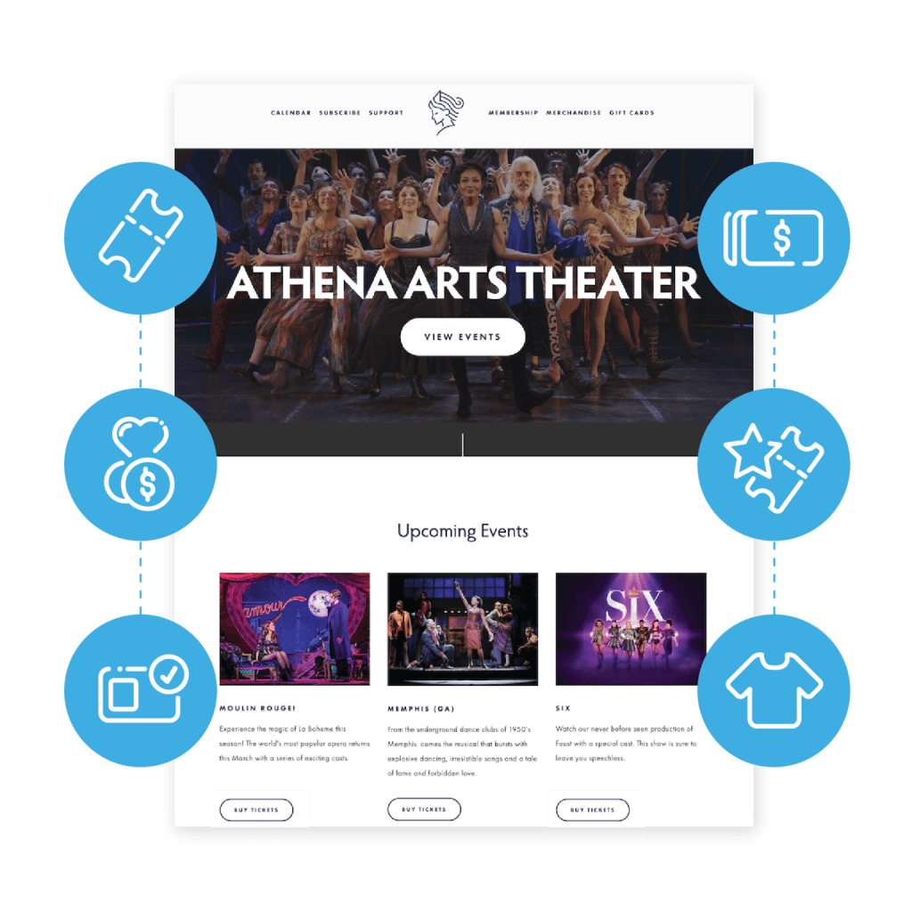 AudienceView is designed around the full patron journey. Teams can create distinct products for tickets, subscriptions, memberships, donations, concessions, and merchandise – with auto-applied benefits, native upsells, optimized checkout flows, and simple self-service for patrons.